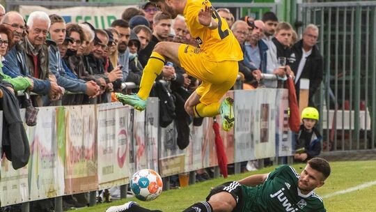 Hoch gesprungen, aber 1:3 verloren: Umut Sentürk (gelbes Trikot) und die TuS Koblenz konnten im Oberliga-Auswärtsspiel beim SV Waldalgesheim nicht überzeugen. Am Sonntag im Heimspiel gegen Eintracht Trier müssen die Schängel zulegen, um zu punkten. Michael Ottenbreit