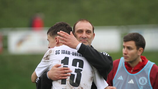 Marco Reich herzt Fabian Sagawe. Der Trainer des SC Idar-Oberstein hatte dem 22-Jährigen, der übrigens im Trikot von Leon Koerdt auflief, sein Vertrauen geschenkt und ihm zum Oberliga-Debüt verholfen. Mit Erfolg... Hähn Joachim. Joachim Hähn