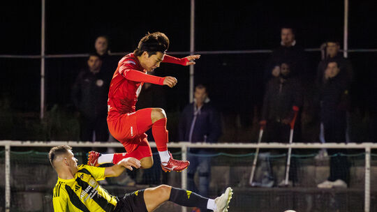Überspringt Rot-Weiss Koblenz mit Kanata Todate (in Rot) auch die Hürde Gonsenheim am Sonntag? Am Mittwochabend gegen Dudenhofen waren die Koblenzer obenauf, Todate steuerte den Treffer zum 4:1-Endstand bei. Tobias Jenatschek