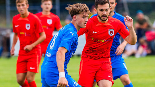 Am 5. August beim 1:0-Heimsieg gegen Bitburg verletzte sich der defensive Mittelfeldspieler Kevin Engelmann (in Blau) am Knie, der Sommerzugang des FC Karbach fiel mehr als zwei Monate aus. Am Mittwoch feierte Engelmann ein 20-minütiges Comeback beim 3:0-Pokalsieg gegen West-Bezirksligist Langsur. Der frühere Ahrweilerer und erst 19 Jahre alte Engelmann will nun mithelfen, dass seine Karbacher nach Oberliga-Niederlagen in Folge nicht auch am Samstag beim FV Dudenhofen das Nachsehen haben. Foto: hjs-Foto Hermann-Josef Stoffel