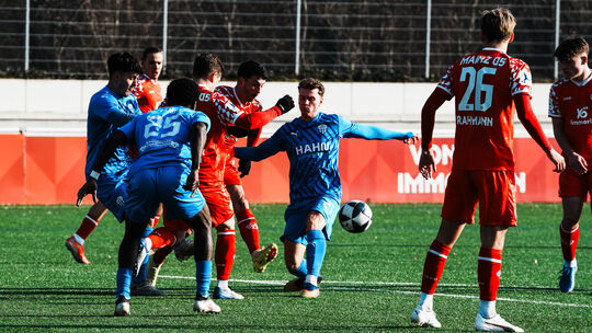 Der FC Emmelshausen-Karbach (in Blau) hat bei der U23 des FSV Mainz 05 eine 1:5-Testspielniederlage kassiert, hielt aber vor allem in der ersten Hälfte sehr gut mit. Matthias Bernd