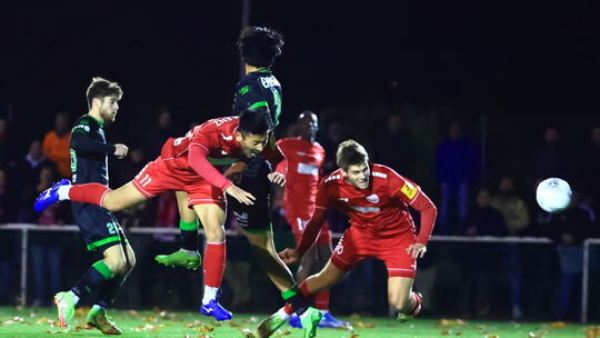 Verrückte Endphase auf dem Oberwerth: Jerome Albera (rechts) köpft in dieser Szene zum 2:2-Ausgleich für den FC Rot-Weiss Koblenz ein. Damit war die RWK-Aufholjagd noch nicht beendet. Foto: René Weiss René Weiss