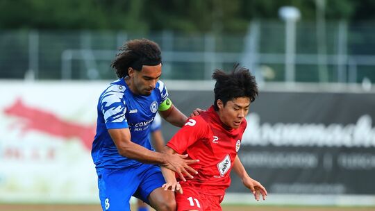 Dieses Duell aus dem Hinspiel wird es am Freitagabend ab 19.30 Uhr nicht geben, denn Cosmos-Kapitän Nihat Farajli (in Blau) wird verletzt fehlen, Rot-Weiss-Außen Kanata Todate ist dagegen dabei auf dem Oberwerth-Kunstrasen. Das Hinspiel fand im Stadion statt - und endete 2:1 für Cosmos, hatte aber die unendliche Wechselfenster-Geschichte als Nachspiel. René Weiss