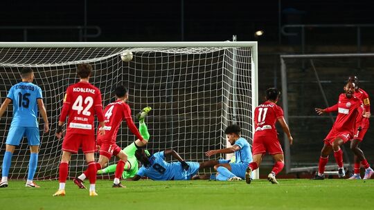 Das 1:0 für den FC Rot-Weiss Koblenz in der 24. Minute: Kapitän Alexis Weidenbach (Zweiter von Rechts in Rot) trifft im Anschluss eines Eckstoß' ins Tor des FC Cosmos Koblenz. Foto: René Weiss René Weiss