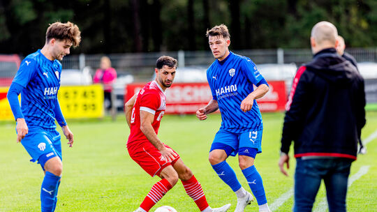Emmelshausen-Karbachs Janik Otto (in Blau, rechts) präsentiert sich in dieser Saison in Torlaune: Nach zehn Spieltagen hat der Mittelfeldspieler schon sieben Treffer erzielt, den jüngsten zum entscheidenden 5:4 beim Sieg am Mittwoch bei Eisbachtal. hjs-Foto