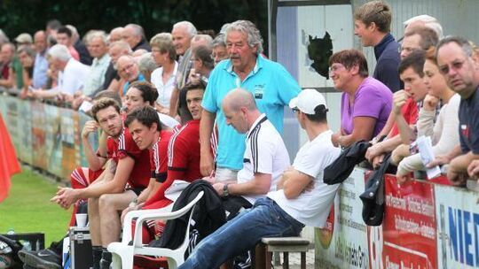 Schwer gestresst wirkt SVR-Manager Rudi Schmitz (im hellblauen Poloshirt) von den Verhandlungen um die Zukunft des Vereins; Trainer Uwe van Eckeren (rechts) plant wohl schon den neuen Spielerkader. Foto: Jörg Niebergall