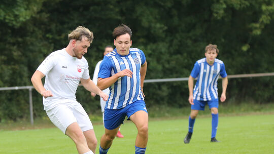 Auf den FC Ebernburg (blaue Hosen, im Duell mit dem TSV Hargesheim) wartet am Samstag das Derby und Jahrmarktsspiel in Feilbingert. Edgar Daudistel