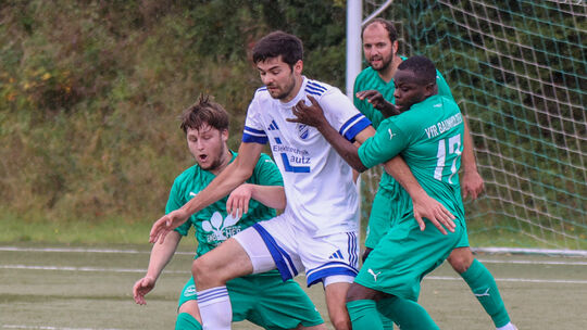 Um Robin Weber zu stoppen, braucht es auch schon mal drei Spieler. Im Kollektiv bremsen die Akteure des VfR Baumholder II bei ihrem 5:1-Heimsieg hier den Wildenburger Angreifer. Stefan Ding