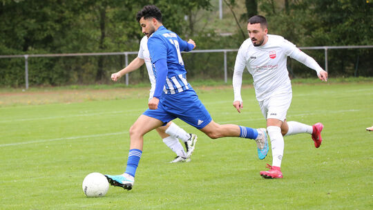 Das 1:0 für den FC Bavaria Ebernburg: Tamim Sediqi (blaues Trikot) zieht ab. Der TSV Hargesheim gleicht später noch aus. Edgar Daudistel