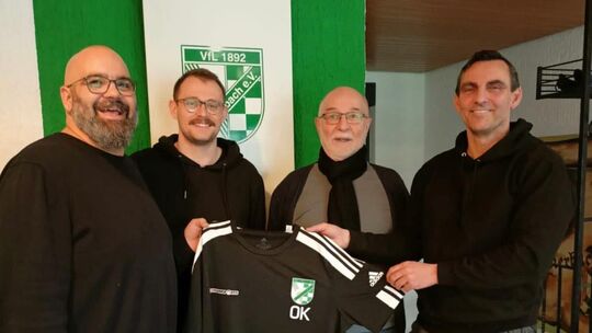 Oliver Kost (rechts) sorgt beim VfL Weierbach für Freude und Zuversicht. Der designierte Vorsitzende und Jugendleiter Mario Sellaro (links), Fußball-Abteilungsleiter Adrian Dick und der 2. Vorsitzende Karl-Heinz Kullmann präsentieren den künftigen Trainer. Foto: Helmut Purper/VfL Weierbach Helmut Purper