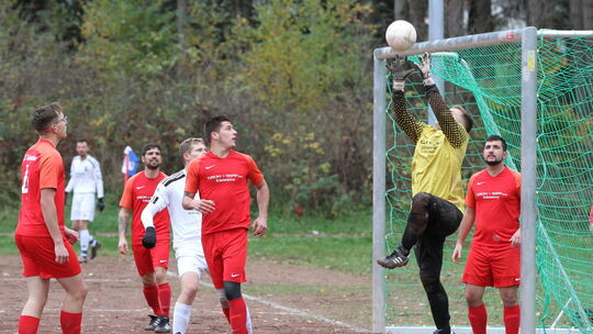 Die Situation sieht ungefährlich aus, aber gleich fällt das 1:0 für die Spvgg Wildenburg. Niklas Haas (weißes Trikot, verdeckt) wird zur Führung abstauben, weil der Tiefensteiner Torwart den Ball nicht unter Kontrolle bringen wird. Foto: Joachim Hähn Joachim Hähn