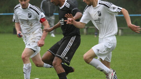 Die Wildenburger Benjamin Weyand (links) und Pascal Hagner attackieren den Regulshausener Spielertrainer Sven Mensah. Letztlich siegten die Wildenburger souverän 2:0. Foto: Joachim Hähn Hähn