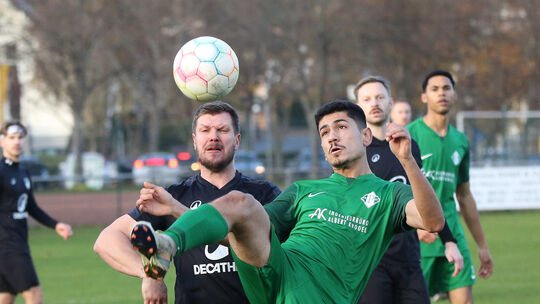 Hoch das Bein: Der Spieler der TSG Planig II (grünes Trikot) klärt vor einem Roxheimer. Der TuS ist am Sonntag bei Schlusslicht TSV Bockenau II am Start. Edgar Daudistel