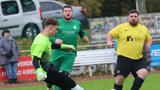 Mitspielender Torwart: Der Planiger Tristan Behrend spielt den Ball im Duell mit dem VfL Rüdesheim (gelbe Trikots) sauber mit der Innenseite. Am Sonntag möchte er im Derby in Winzenheim seinen Kasten sauber halten. Edgar Daudistel