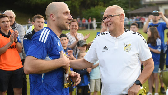 Ein großer Moment: Simon Schmidt (links) wird nach dem Sieg über den TSV Hargesheim im Entscheidungsspiel in Rehborn von Staffelleiter Martin Steeg als Meistertrainer der A-Klasse Bad Kreuznach ausgezeichnet. Schmidt bleibt seinem TuS Waldböckelheim erhalten, hat die Zusage für eine weitere Spielzeit gegeben. Foto: Klaus Castor Castor Klaus. Klaus Castor