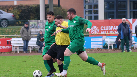 Sandwich: Zwei Planiger Abwehrspieler attackieren den Rüdesheimer Angreifer Cihan Yakut, der das wichtige 1:2 erzielte und immer besser in Fahrt kommt. Edgar Daudistel
