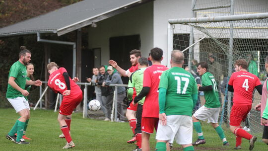 Viel Betrieb vor dem Tor im Pulverloch. Der TuS Hintertiefenbach (in grün) bezwang den TuS Breitenthal II 2:0. Hähn Joachim. Joachim Hähn