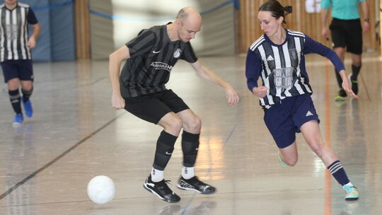 Die erste Frau, die bei einem Hallenfußballturnier der Männer im Kreis Birkenfeld ins Schwarze trifft: Anna Justen (rechts) umkurvt einen Spieler der SG Rhaunen/Bundenbach. Hähn Joachim. Joachim Hähn