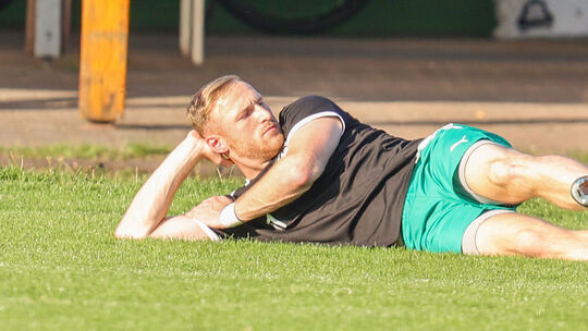 Danny Lutz bei der Gymnastik. Der Angreifer des VfR baumholder hat seine Muskelverletzung überwunden und könnte beim Top-Spiel bei Tabellenführer SC Hauenstein zum Einsatz kommen. Stefan Ding