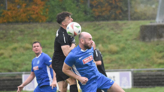 Lässt die Bad Kreuznacher Eintracht spät jubeln: Yannik Wex (blaues Trikot) zeigt im Duell mit der TuS Marienborn viel Einsatz und erzielt in der Schlussminute das 2:2. Klaus Castor