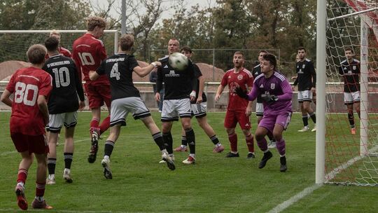 Das 1:0 für den FC Schmittweiler: Aurel Rech (rotes Trikot, Nummer 10) köpft einen Eckball ein. Jeffrey Renner (Mitte) ahnt schon, dass die Führung winkt. Ottenbreit Michael. MO-Fotos.de