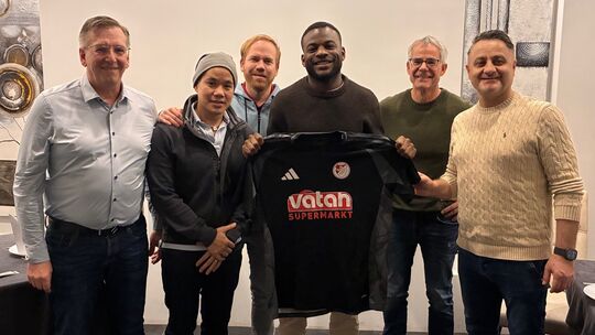 Freuen sich auf die Zusammenarbeit beim TuS Winzenheim: Markus Becker (Kassenwart, von links), Huy Ngo (Vorstand Jugend), Sebastian Grünewald (Schriftführer), Zugang Levi Mukamba, Rainer Winkels (Vorsitzender) und Ercan Ürün (Trainer). Winkels