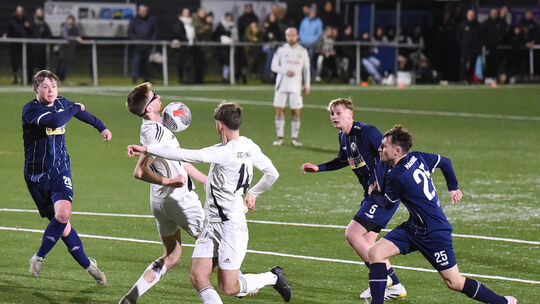 Gleich fällt das 3:2: Der Meisenheimer Johannes Körner (mit Brille) stoppt den Ball elegant mit der Brust und legt ihn auf Torschütze Noel Eckel ab. Die Hackenheimer Paul Protzel (von links), Leon Baderschneider und Henrik Sperling können ihn nicht daran hindern. Klaus Castor