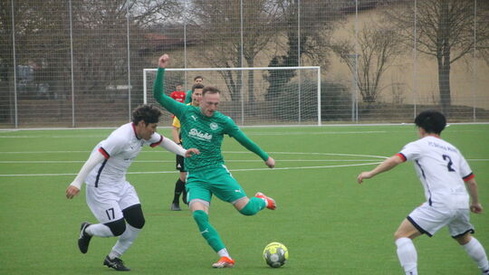 Danny Lutz beim Versuch, Gegenspieler Emu Kasahara zu verladen. Der VfR Baumholder kassierte eine 1:3-Niederlage beim FC Basara Mainz. Schlenger Matthias. Matthias Schlenger