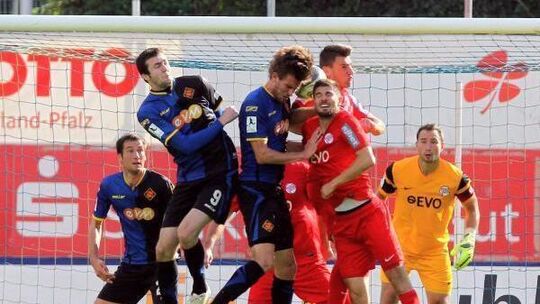 Standardsituationen sind die derzeit schärfste Waffe der Schängel: Per Kopf erzielte denn auch Danko Boskovic (ganz links im Bild) das 1:0 gegen Offenbach. Das sollte in der Endabrechnung aber nicht zu einem Punktgewinn gegen die Kickers reichen, auch wenn die Koblenzer Kollegen Daniel Reith (in der Mitte) und Bence Szenes (links daneben) es hier der Nummer 20 nachmachen wollten. Ob das in Kassel vielleicht wieder besser klappt? Foto: René Weiss