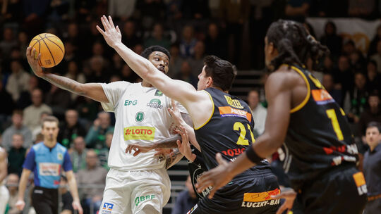D. J. Jeffries (am Ball) und die Koblenzer Baskets spielten sich gegen Kirchheim teils hohe Führungen heraus, unterlagen am Ende aber nach Verlängerung mit 98:105. Wolfgang Heil