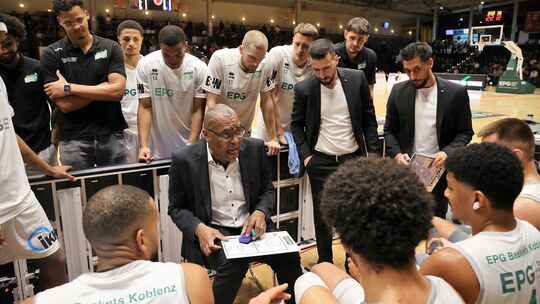 Weiterhin ein Prozess: Baskets-Trainer Pat Elzie (Mitte) möchte seine Koblenzer Spieler kontinuierlich verbessern. Foto: Jörg Niebergall Jörg Niebergall