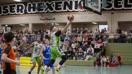 Zeljko Novak macht hier zwei seiner 32 Punkte: Der Kroate führte den TuS Treis-Karden zum 88:83-Derbysieg gegen den BBC Horchheim, der im Treiser Hexenkessel vor 400 Zuschauern seine erste Saisonniederlage kassierte. Sascha Berkele