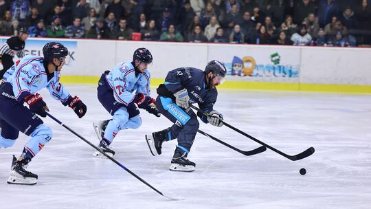 Michael Jamieson (blaues Trikot) und der EHC Neuwied dominieren derzeit das Geschehen in der Central European Hockey League. Am Sonntag wollen die Bären ihren Erfolgslauf in Heerenveen fortsetzen. René Weiss