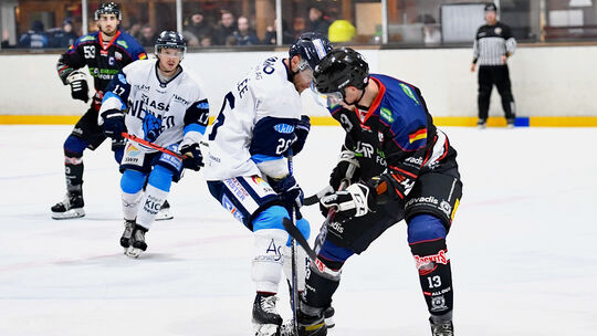 Unser Foto zeigt Nils Wegner mit Neuwieds Ex-Rocket Kevin Lavallee im Kampf um die Scheibe. Andreas Hergenhahn