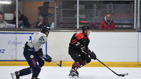 Maximilian Kolesnikov (rechts) sorgte beim Krimi am Heckenweg mit seinem Treffer im Penaltyschießen für das Happy End der EGDL-Partie gegen die Eisadler aus Dortmund. Andreas Hergenhahn