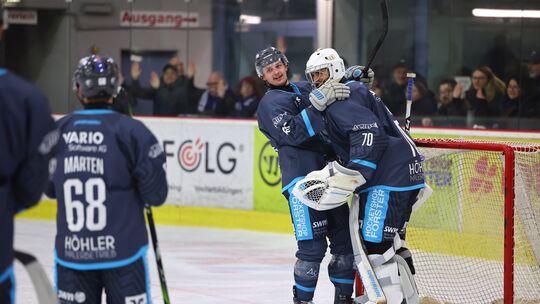 Grund zu jubeln hatten die Spieler des EHC Neuwied (hier Ludvig Hedström und Jonas Gähr) in den vergangenen Wochen reichlich. Zum Abschluss der Hauptrunde im Pokalwettbewerb geht es für die Bären darum, sich eine möglichst gute Ausgangslage für die Halbfinalspiele zu verschaffen. René Weiss