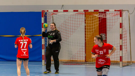 In der Favoritenrolle stecken die Wellinger Handballerinnen um Torfrau Hannah Wolf (am Ball, rechts Maya Kohlenbeck, links mit Nummer 77 ist Annalena Adams) im Heimspiel gegen die Wittlicher Reserve. HetPix Fotodesign. HetPix
