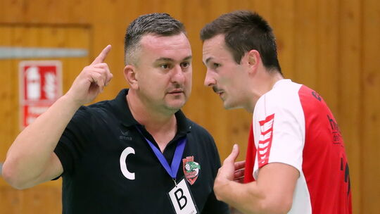 Gegen die zuletzt bärenstarke Vallendarer Defensive, die beim Sieg in Saulheim gegen den bis dato noch verlustpunktfreien Spitzenreiter nur 21 Gegentore kassierte, wird es sicher auch für die HSG Kastellaun/Simmern schwer. Coach Mirza Cehajic (links) und Rückraumakteur Julian Mangold müssen sich etwas einfallen lassen. Foto: B&P Schmitt K.F.Schmitt B & P Schmitt. B&P Schmitt