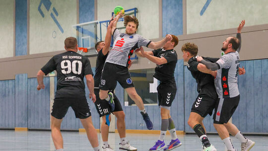 Einfach nicht zu halten: Samir Moser (am Ball) traf aus dem Spiel heraus und vom Siebenmeterpunkt insgesant 13 Mal für die HSG Westerwald. Hier versuchen (von links) Schweichs Kristian Müller, Patrick Karrenbauer, Alexander Quary und Matthias Mikolai, den besten Werfer der Gastgeber zu stoppen. Horst Wengenroth. Photo: (c) Horst Wengenroth 2026