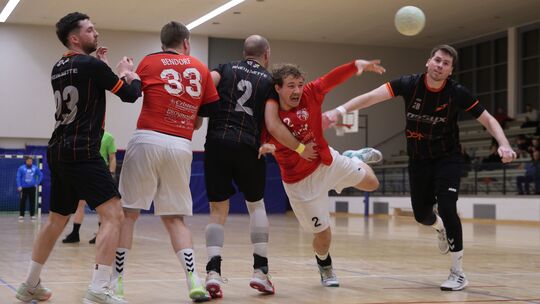 Die HSV Rhein-Nette (in Schwarz, von links mit Philipp Klein, Spielertrainer Yannik Kessels und Patrick Heckenbach) verkaufte sich gegen die Turnerschaft Bendorf um (von links) Philipp Hoffend und Felix Ley besser als im Hinspiel, verlor aber dennoch mit 29:33. Jörg Niebergall