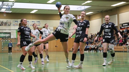 In der Regionalliga setzte sich die HSG Hunsrück (in Schwarz) um (von links) Hanna Faust, Helen Schieke und Emma Lesch mit 27:20 beim HC Koblenz Anfang Oktober durch. Im Viertelfinale des HVR-Pokals stehen sich beide Klubs am Sonntag (17 Uhr) in Kleinich gegenüber. Jörg Niebergall