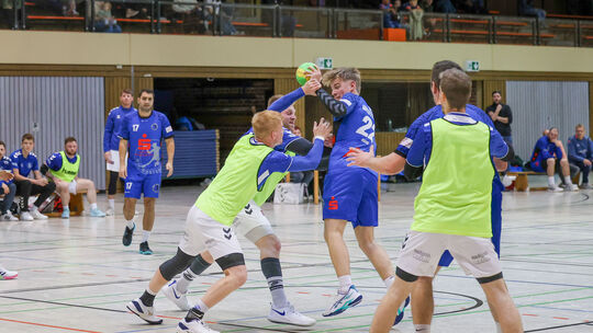 Die HSG Westerwald (in Blau, am Ball Adrian Kulm) musste sich gegen einen starken Gegner aus Gerolstein behaupten und in der Schlussphase noch mal zittern. Doch es reichte zum Heimsieg. Horst Wengenroth. Photo: (c) Horst Wengenroth 2025