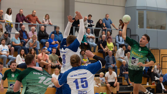 Bei der TSG Ober-Hilbersheim (weiße Trikots) ging es ganz schön zur Sache, wie Max Maschtowski, der Kreisläufer des HSV Sobernheim, feststellen musste. Nun steht das erste Heimspiel an. Edgar Daudistel