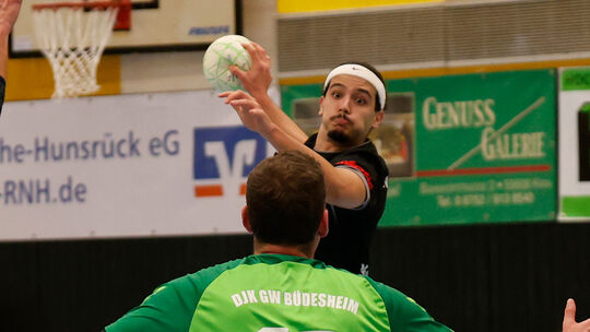 Wurfgewaltig: Younes ben Maouia (in Ballbesitz) hat das Tor fest im Blick und lässt sich von seinem Büdesheimer Gegenspieler nicht ablenken. Sechs Treffer verbucht das Rückraum-Ass der HSG Nahe-Glan. Edgar Daudistel