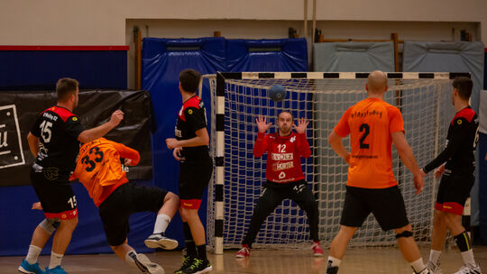 Spieler des Spiels: Sebastian Monschauer (rotes Trikot) brachte die Offensive der HSV Rhein-Nette (orangefarbene Trikots, links Sven Richter) zur Verzweiflung. In seinen Paraden sahen auch die beiden Trainer im Derby den Schlüssel zum Auswärtserfolg des TV Welling (schwarze Trikots). Foto: HetPix HetPix Fotodesign - Stephan Hett