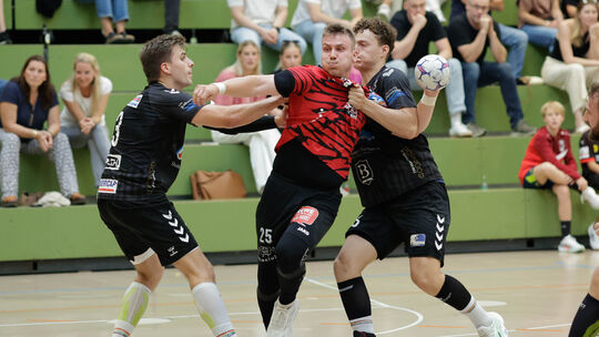 Der Vallendarer Jan Waldgenbach (rotes Trikot, am Ball) wird hier von zwei Budenheimern in die Zange genommen - insgesamt hatten die Rheinhessen dem HVV aber nicht viel entgegenzusetzen. Wolfgang Heil