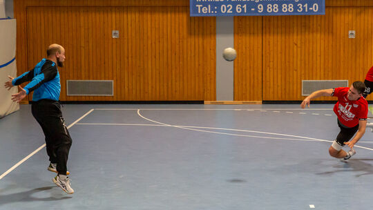 Der Wellinger Lukas Hürter (rotes Trikot) hat sich freigespielt und den Ball Richtung Bad Emser Tor geworfen - der TVW-Routinier steuerte fünf Treffer zum 24:22-Heimsieg bei. HetPix Fotodesign. HetPix