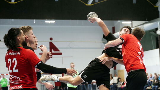 Vollen Einsatz müssen die Handballer des TV Welling (rote Trikots) und des TuS Weibern (schwarze Trikots) zeigen, wenn sie in ihren Heimspielen bestehen wollen. Jörg Niebergall