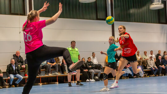 Nach dem klaren Heimsieg gegen Bad Ems geht es für die Wellinger Handballerinnen um Nele Mintgen (rotes Trikot, beim Wurf) mit dem Auswärtsspiel bei den Sportfreunden Neustadt weiter. HetPix Fotodesign. HetPix