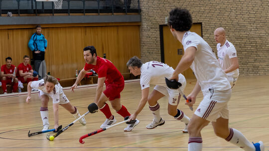Einer gegen alle: Einer gegnerischen Übermacht sieht sich Sebastian Behr (rotes Trikot) gegenüber. Auch im Saisonfinale ist der KHC-Regisseur gefordert. Edgar Daudistel